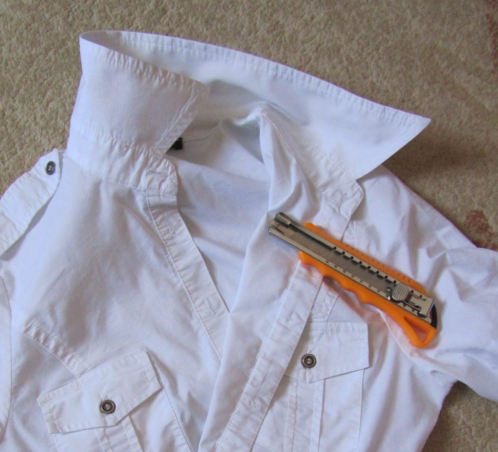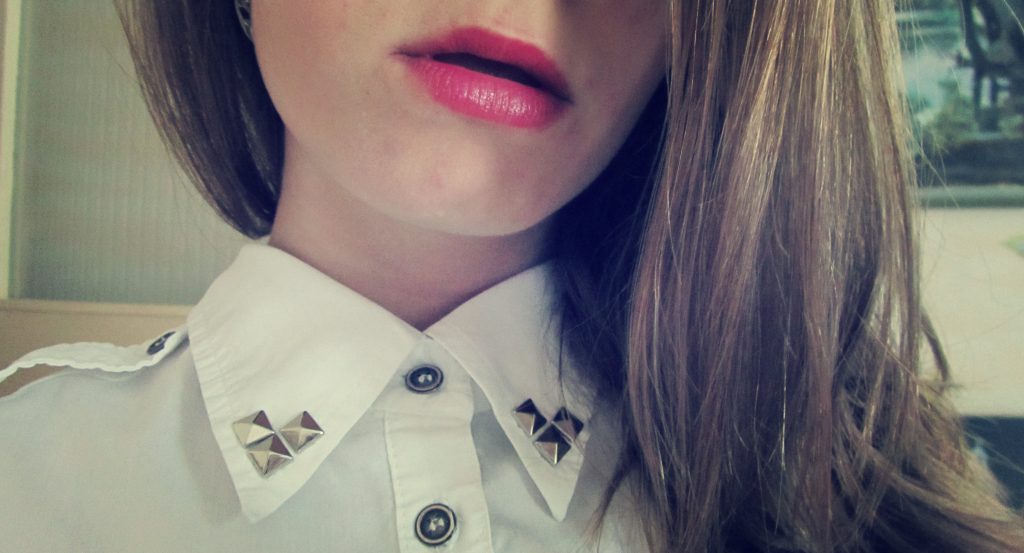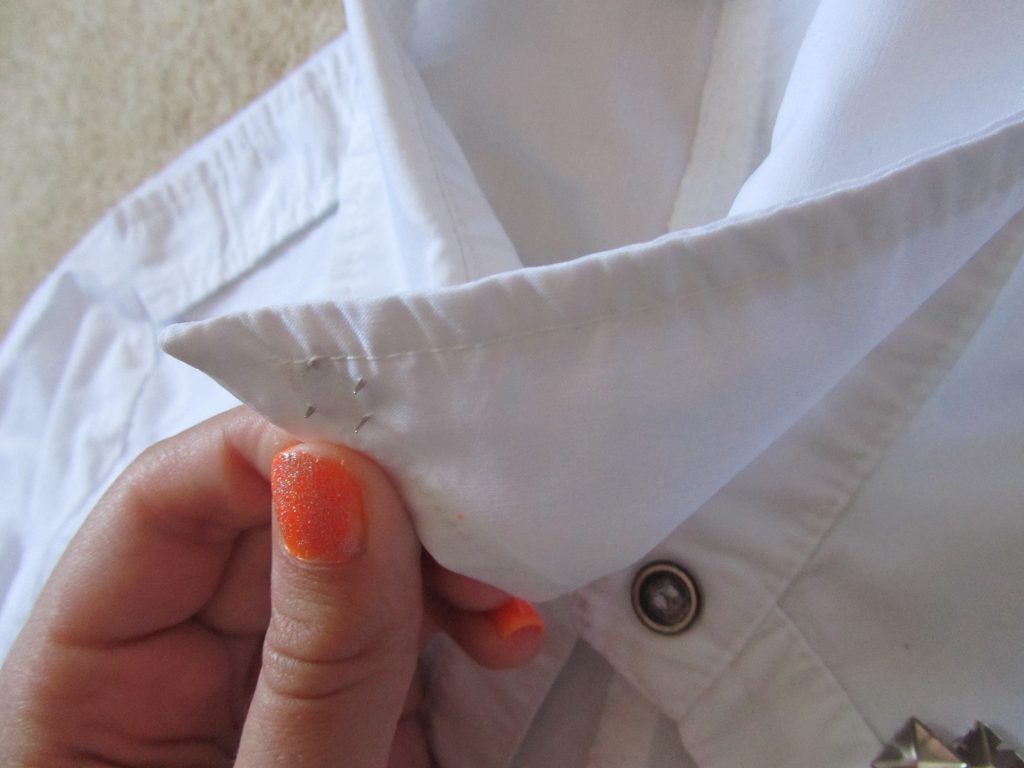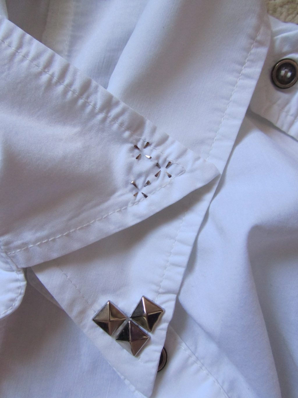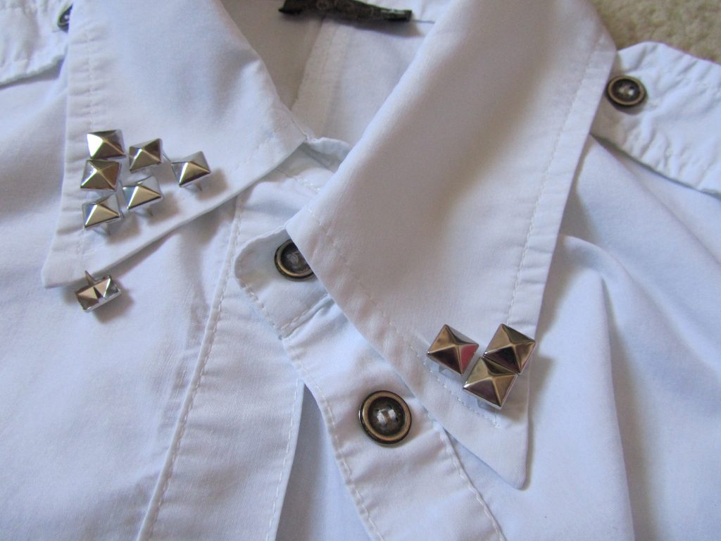 Може би един от най-предпочитаните стилове сред тийнейджърите е „еджи “ стилът. Открояващ се с кожени якета, капси, накъсани дънки, асиметрични поли, тъмни цветове… Лесно и много бързо може да имате акцент в този дух. Ще преобразим яката на най-обикновена бяла риза. А в моя случай – това е униформата ми. Изключително умерено и тактично внасяне на индивидуалност в задължителното училищно облекло! Това, което ще ви дам като идея е поставяне от онези пирамидални метални капси в края на яката.
