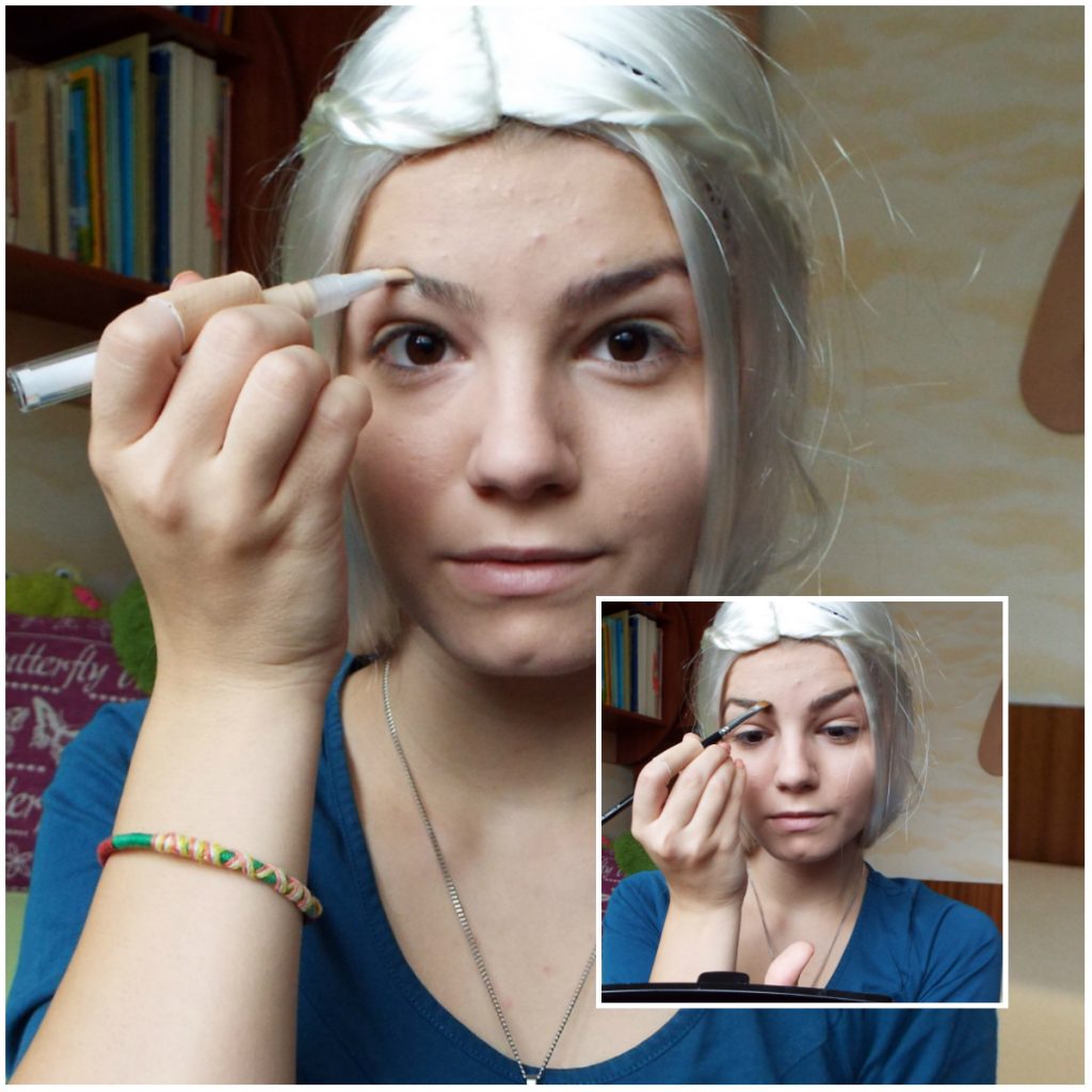 5. Нека преминем към веждите. Веждите на Денерис са много изразени и плътни, но и тъмно руси. Ако цвета на веждите ви се доближава с нейния просто ги попълнете със сенки за вежди (аз използвам матови сенки). Но ако имате тъмни вежди като моите първо ги минете с коректор отгореи след това ги попълнете с по-светъл цвят от този, който обикновено ползвате, но НЕ много по-светъл.