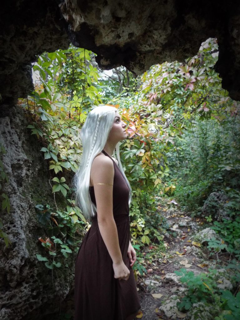 Красивата Денерис от Игра на Тронове! Този Хелуин пресъздавам пълната и визия за вас. Тя има красива, дълга, платиненоруса коса сплетена на женствена плитка. Кожата и е безупречна, а очите – завладяващи и силни. Роклите винаги са семпли, с прости цветове, но винаги величествени и невероятни.