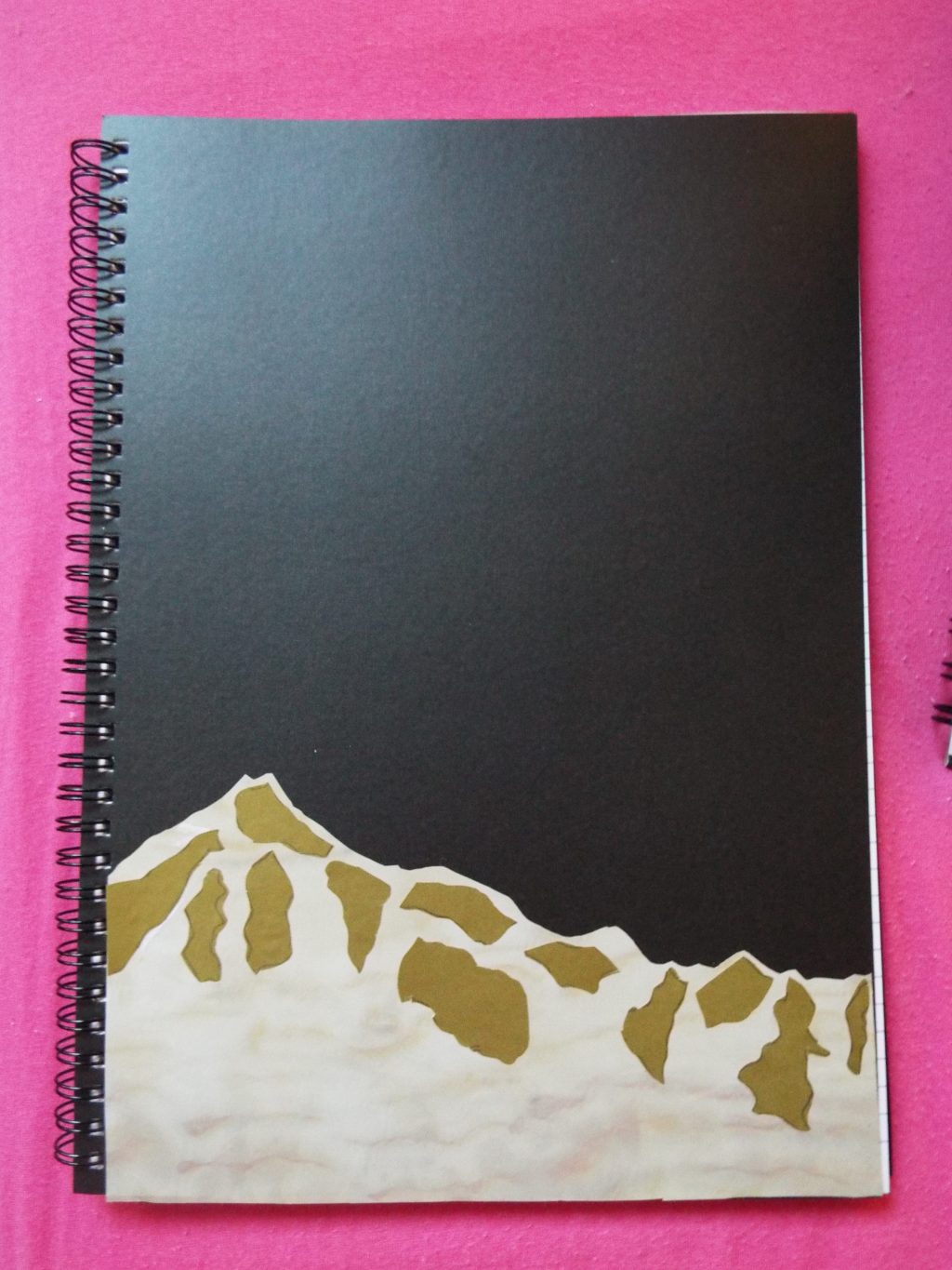 Можете да пресъздавате красиви тетрадки, които сте видели. Аз реших да направя тази тетрадка с планини, която видях в Pinterest. Нарисувах огледално планината върху гърба на мраморната ми самозалепяща се хартия. Изрязах я и залепих върху тетрадката си като започнах от външния край. След това направих снега от златна хартия. Така получих мраморна планина и златен сняг.