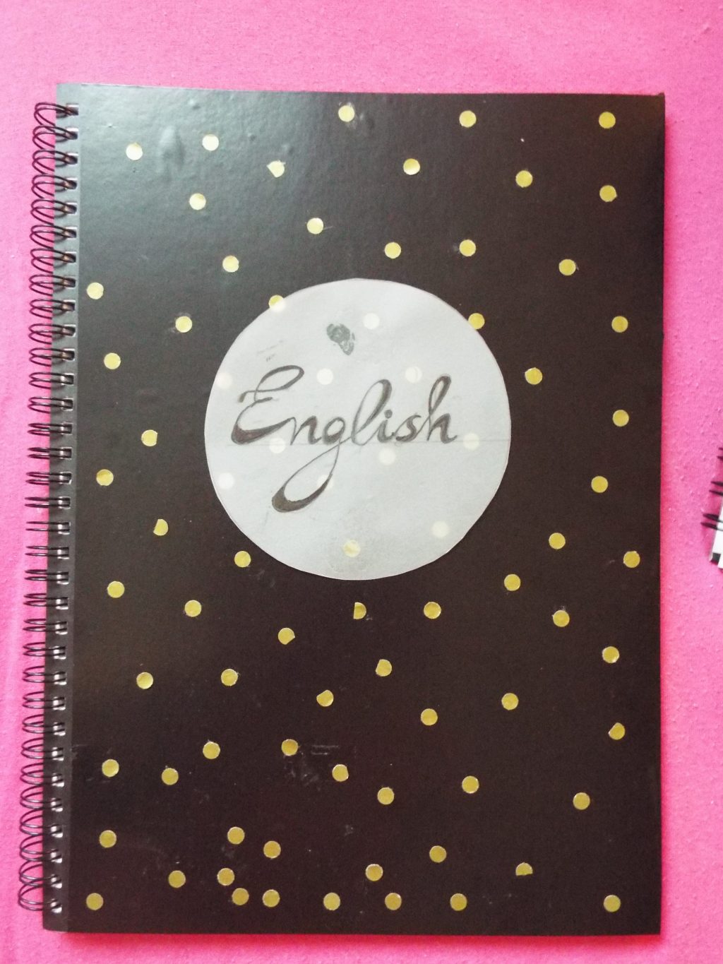 Първо помислете за предметите ви. Тази година имам само 10 предмета, но ще се нуждая от тетрадки за само 6 от тях. Реших да си взема 3 тетрадки с по 2 разделения. Така ще нося по-малко и ще имам 2 в 1 (или всъщност 6 в 3). Също така, ще бъда сигурна, че ще си изпиша тетрадките до край. Купих си всички тетрадки с подходящи цветове, но разбира се промених кориците им и вътрешните разделения. За първата направих златни точки върху черен фон: