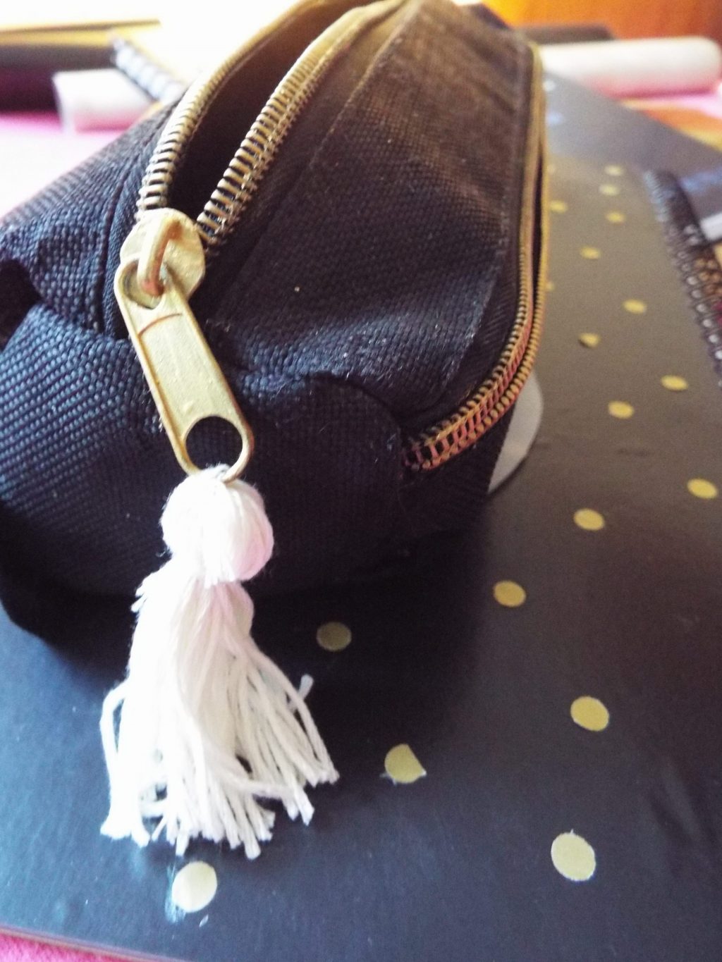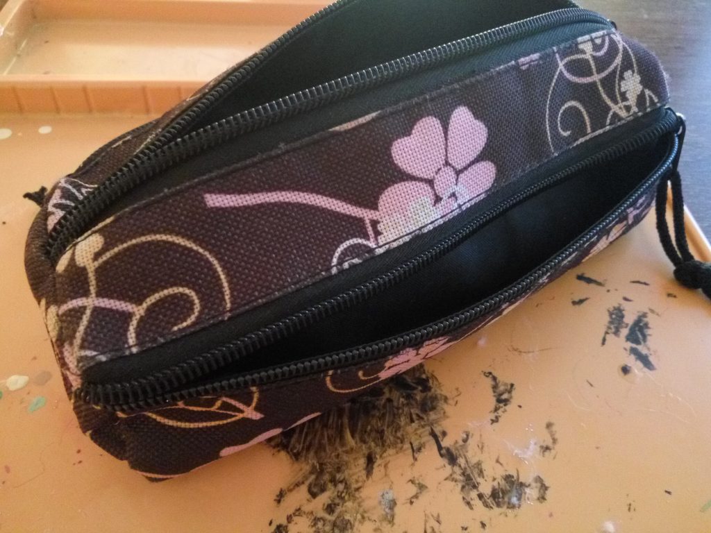 състояние. За това го промених! Преди беше кафяв с розови цветя, черни ципове и връзки на тях. Премахнах връзките ибоядисах целия моливник в черно. Използвах темперна боя и се държи доста добре така че понякога нямате нужда от скъпи текстилни бои. След това боядисах в златно циповете. Страхувах се, че няма да могат да се отварят, но работейки с тънък слой боя нямаше никакъв проблем. Най-накрая направих пискюл от конец за бродиране в цвят шампанско. Увих няколко пъти около четирите си пръста, завързах полученото кръгче с малко парченце конец за дупчицата на ципа, а с друго парченце оформих главичката на пискюлчето. Най-накрая изрязах долната част.