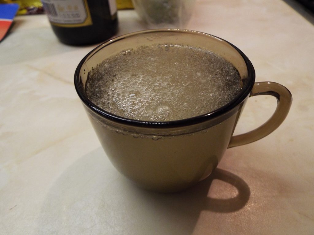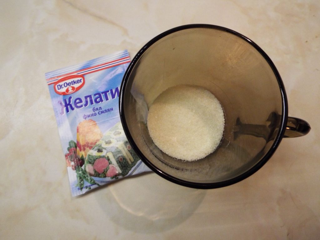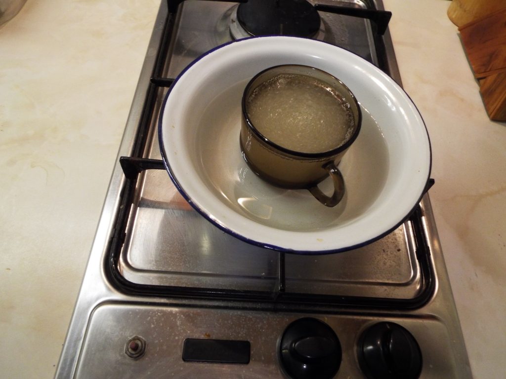 2. Put a bigger cup filled in half with water on the heat an put in it the cup with the gelatin. Stir and wait till the gelatin mix is clear.