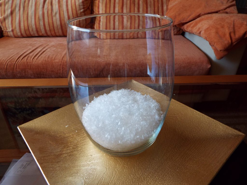 3. Put around 3-4 inches of the fake snow or salt in the glass container.