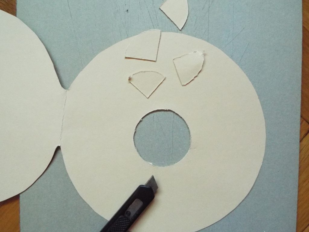 3. Make a smaller circle in the center with the same center point as the bigger one, using compasses. This will be the hole of the donut. Cut it out using the x-acto knife. Repeat this step for the other part of the donut card. But do not work both sides at the same time. The paper is thick and the cutting won`t be nice and even.