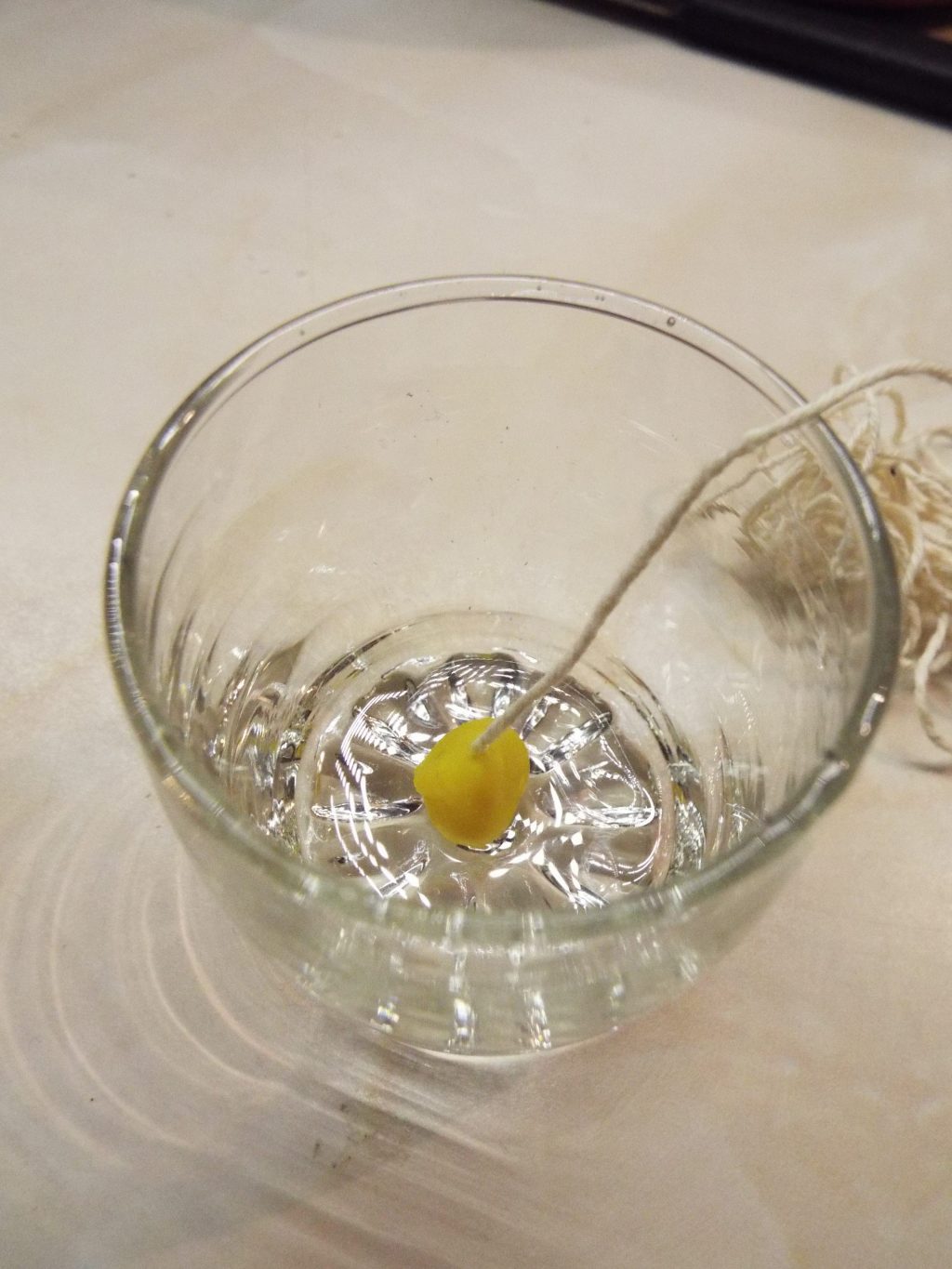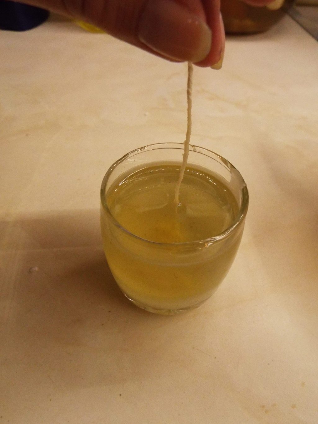 4. While waiting, take a small piece of another candle or from the already warmed one. Flatten it with your fingers and put the wick inside. Then close the piece of candle and make it in a round shape. Finally, put it in the center of a small glass and press well. That way the wick will be centered.