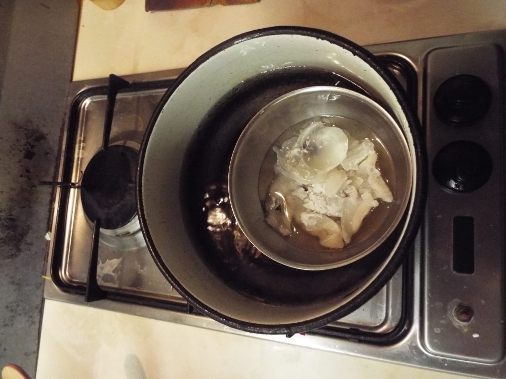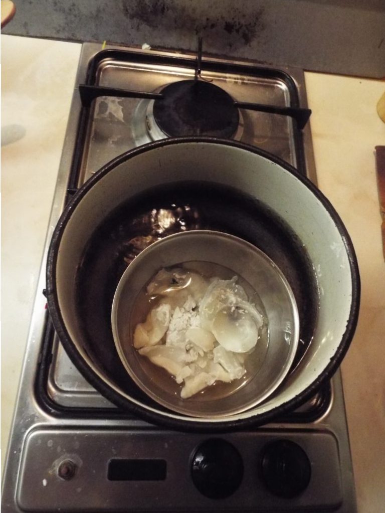 3. Fill the bigger pan with water and put it on the hob. Then put the smaller pan with the candle pieces inside of it. That way the candle will melt.