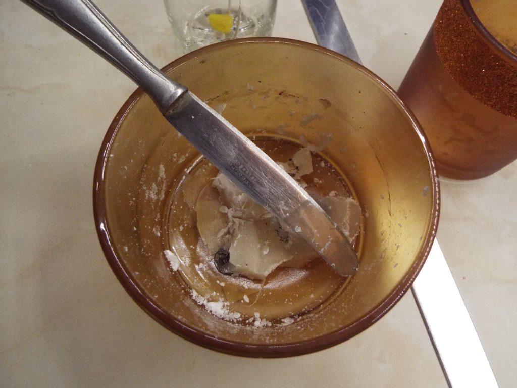 2. Remove the candle from its pot using the knife. It could be a little bit difficult. And put it in a cup. If you have from the big square candle you can cut the candle to the level where the inside of it had burn.