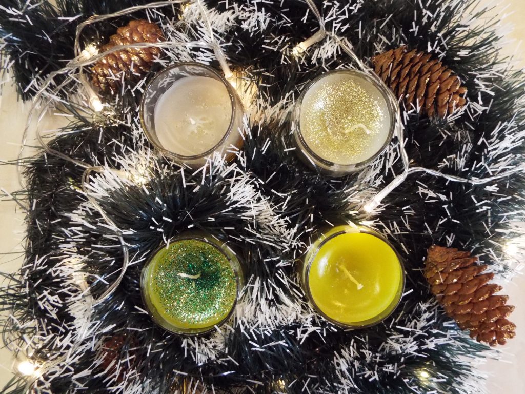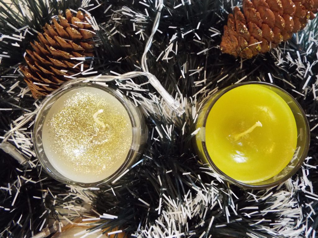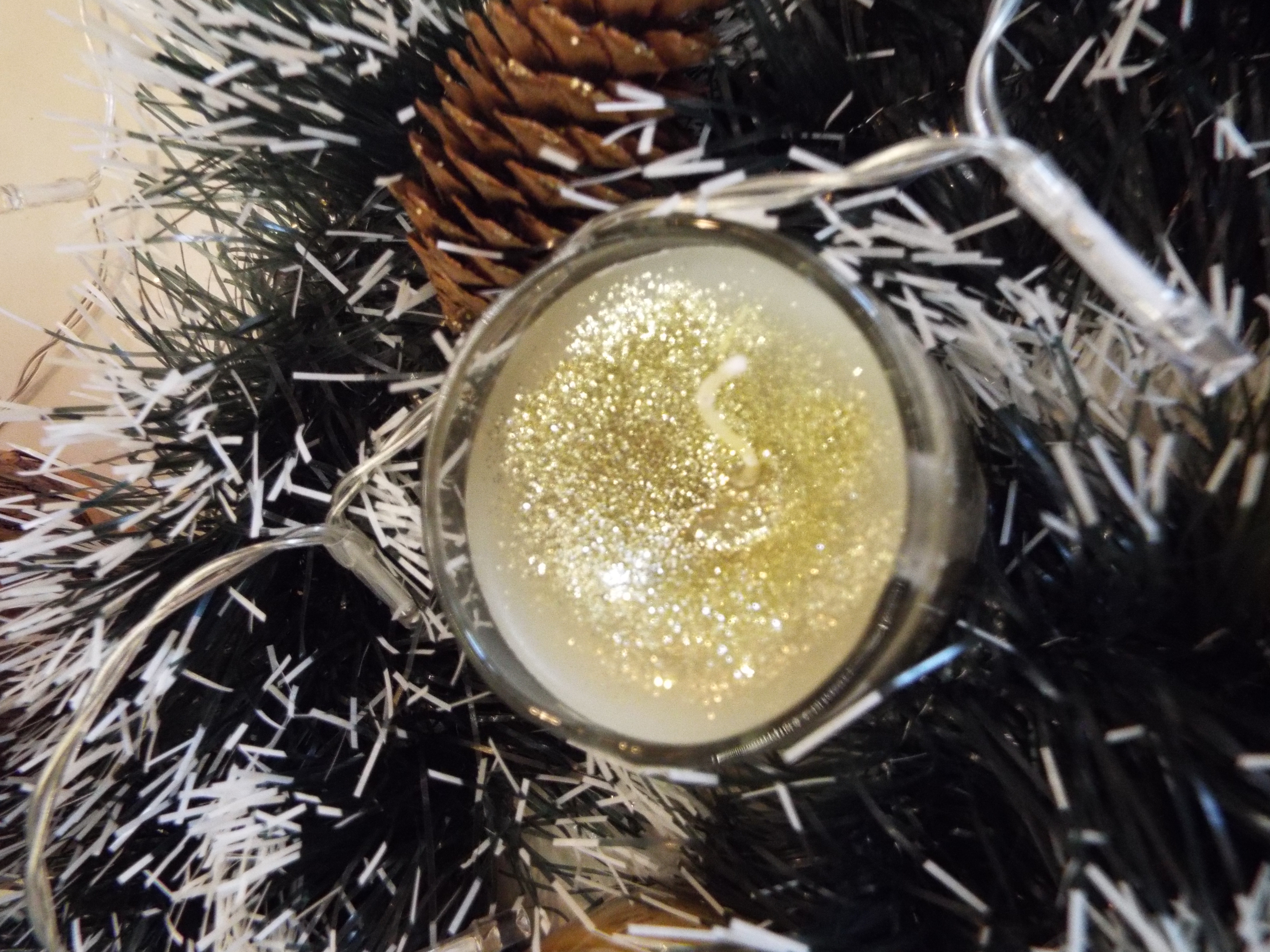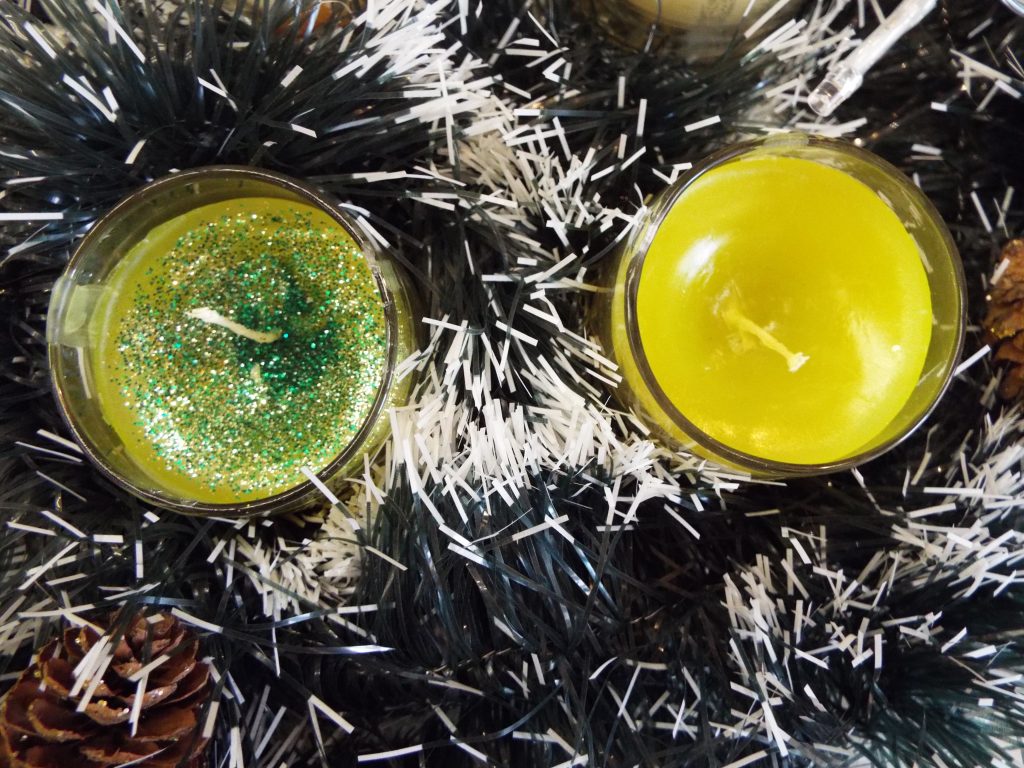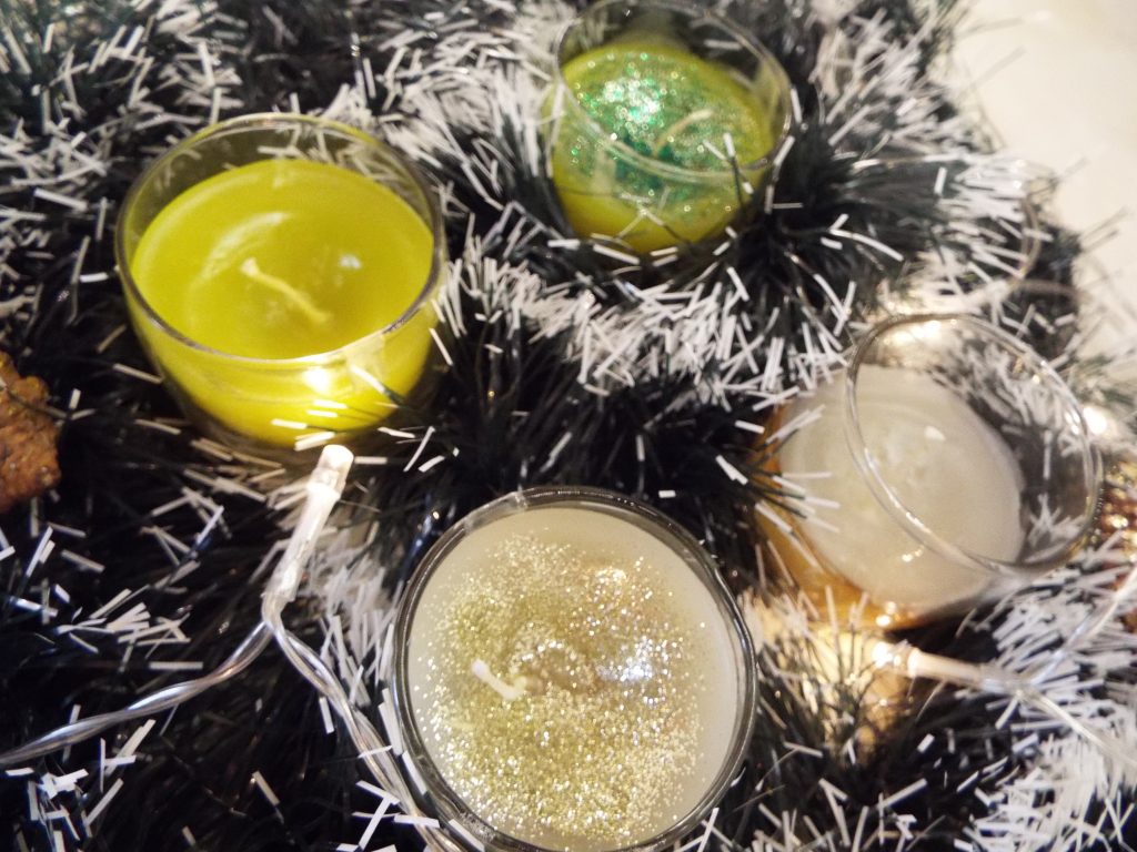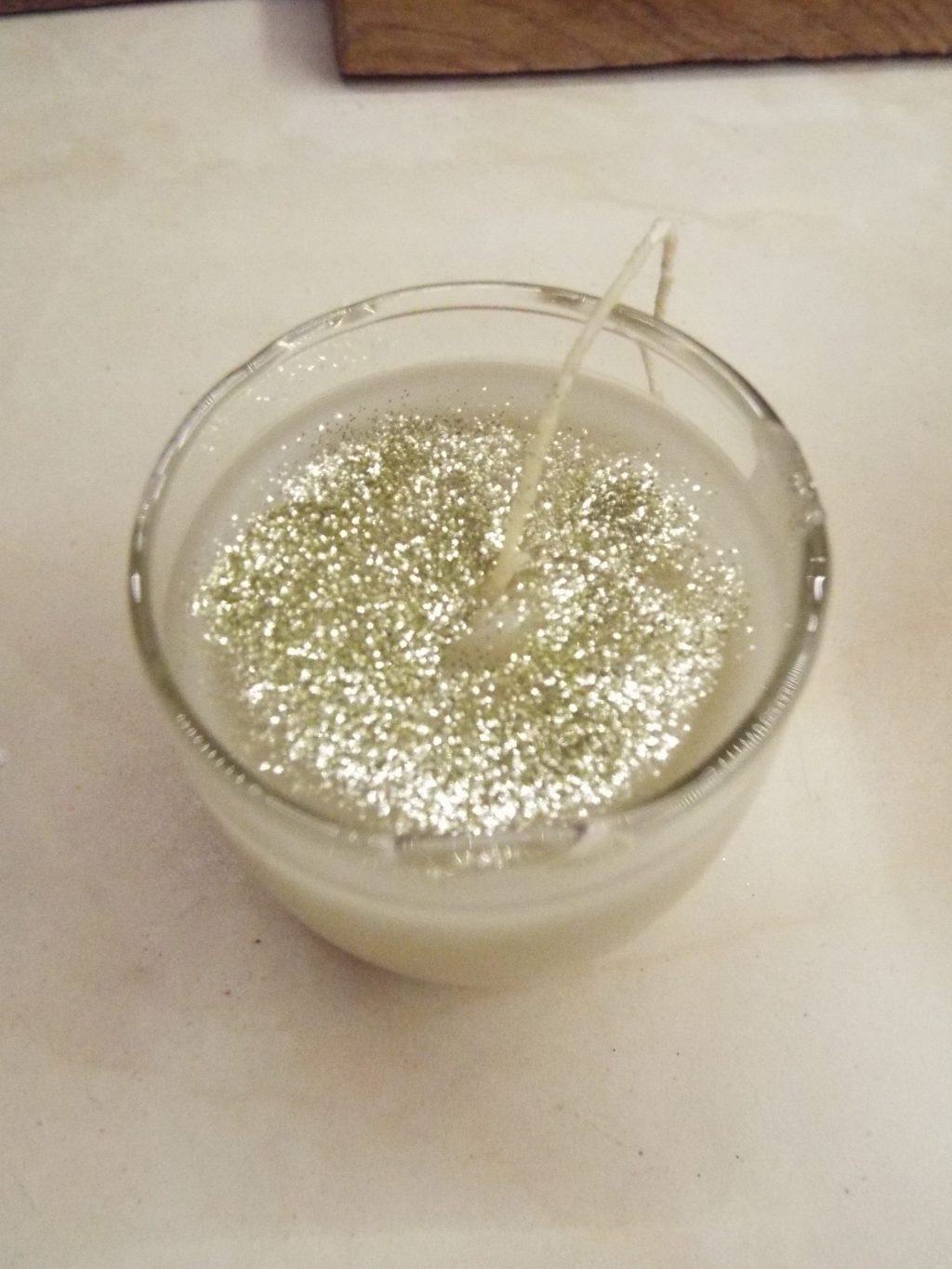 7. Finally, you can decorate your candle. When the candle it is almost cooled cover it with glitter. Also you can make one half of the candle one colour and the other half in other colour and scent. And you can you decorate also the glass.